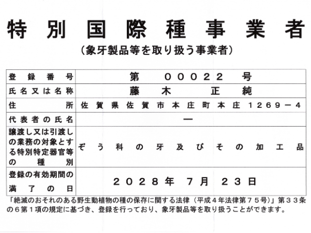 ☆当店は「種の保存法」に基づき、経済産業省に象牙取り扱いの特別国際種事業者として登録されております。事業者登録番号 00022